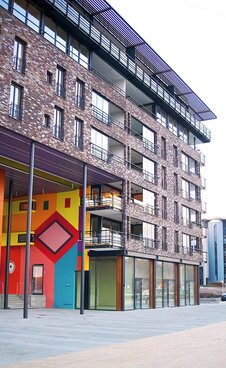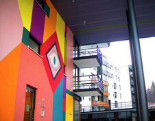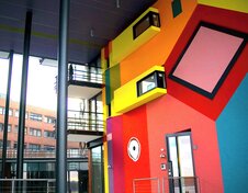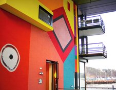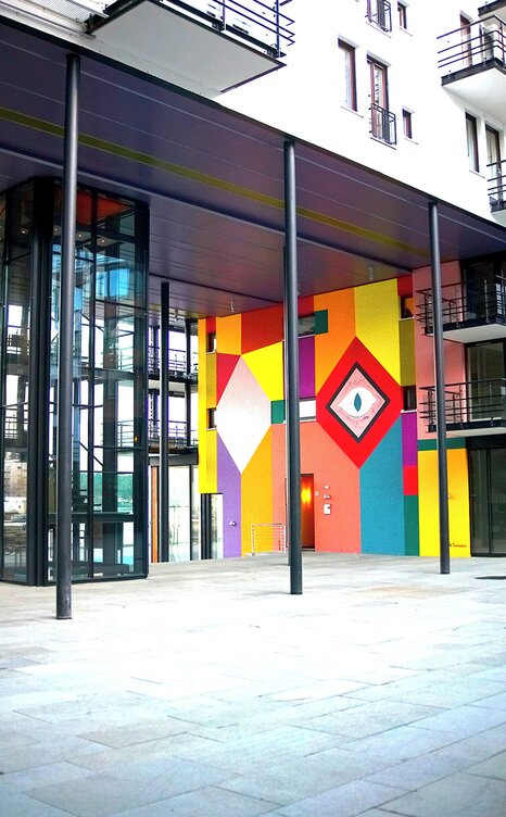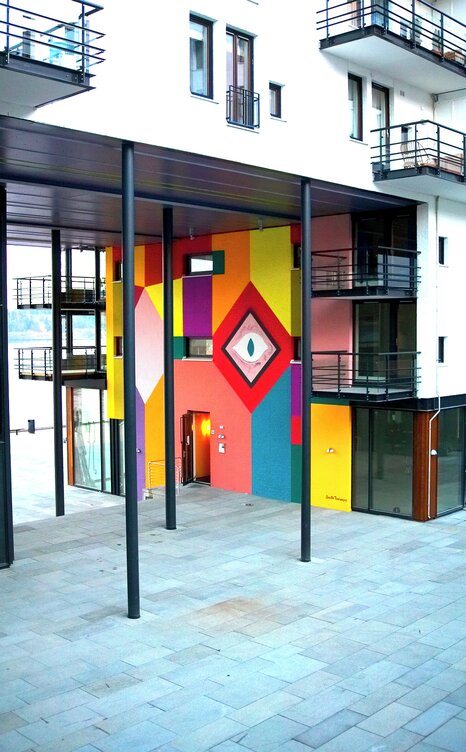 Valget falt på å utsmykke to vegger med to store motiver i portalen mot det nordligste gårdsrommet. Bente Tønnesen fikk oppdraget med å lage forslag til utsmykking av veggene og kom med et par forslag. Det var en spennende kreativ prosess og et litt provoserende forslag. Vi var alle enige om at skulle vi smykke ut så store formater og utradisjonell skala som disse veggene er, måtte det være noe som utfordret og var grensesprengende og aldri var utført på den måten. Resultatet ser vi i dag hvor de som bor og de som besøker området blir fanget av kunstverkets flotte og abstrakte uttrykk. Kunstverket står seg godt og har medvirket til å gi Lysaker brygge mange rosende omtaler og priser, både nasjonalt og internasjonalt. Det er spesielt hyggelig at fotografier fra området blir tatt med det flotte kunstverket vi alle er så stolte av. Tusen takk for en forbilledlig spennende prosess, og ikke minst et kunstverk som er til glede for allmennheten, de som bor og jobber der, og er blitt Lysaker brygges signatur.